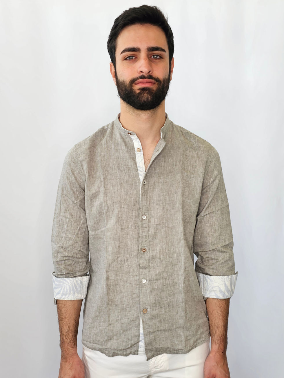 Camicia coreana in lino con dettagli.